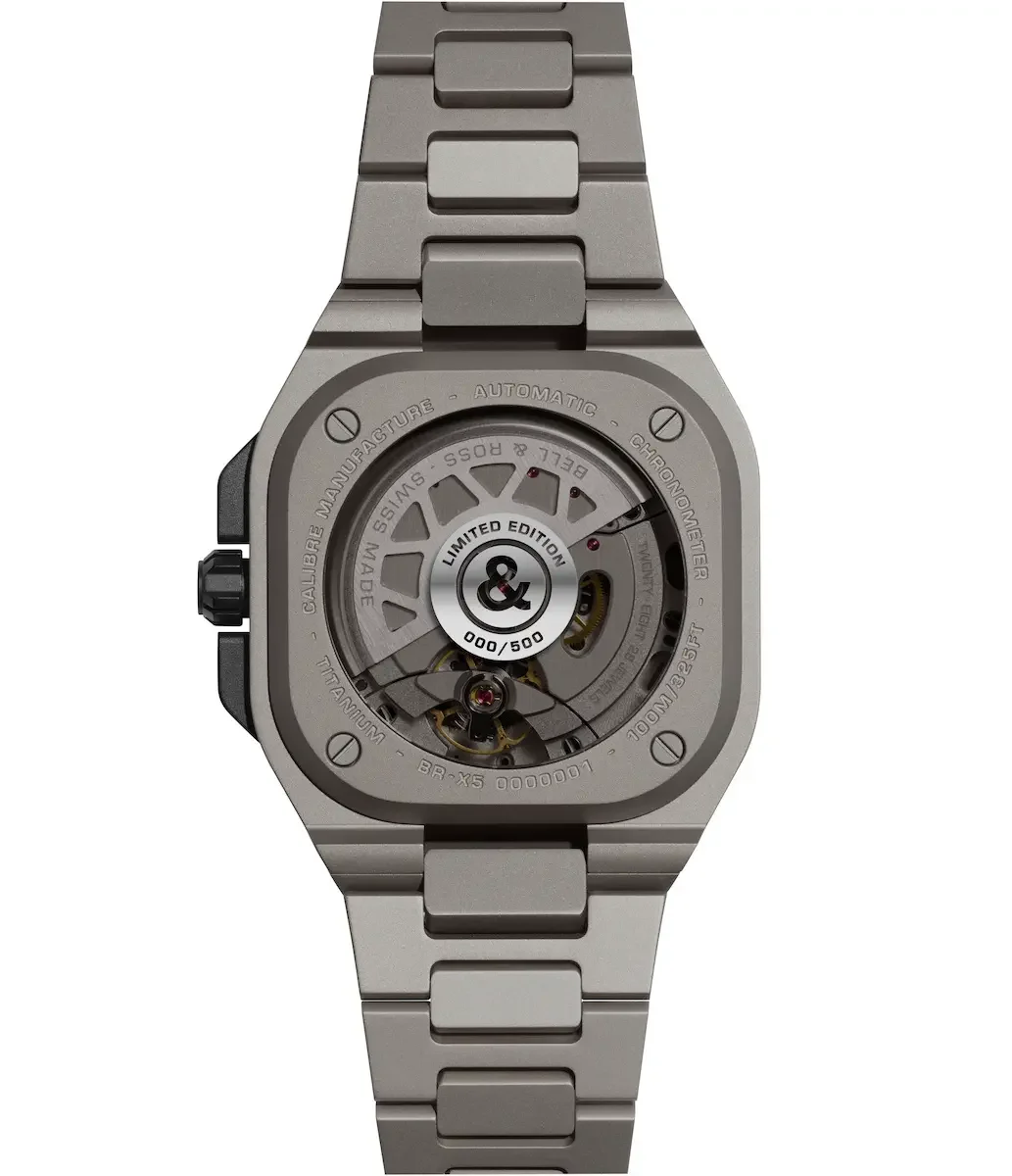 La cassa si presenta con un design audace e tecnico, con un diametro di 41 mm e uno spessore di 12,8 mm, il tutto accompagnato da un’impermeabilità di 100 metri, resa possibile grazie alla corona a vite. Il titanio, noto per la sua resistenza e leggerezza, è il protagonista del nuovo BR-X5 Racing.