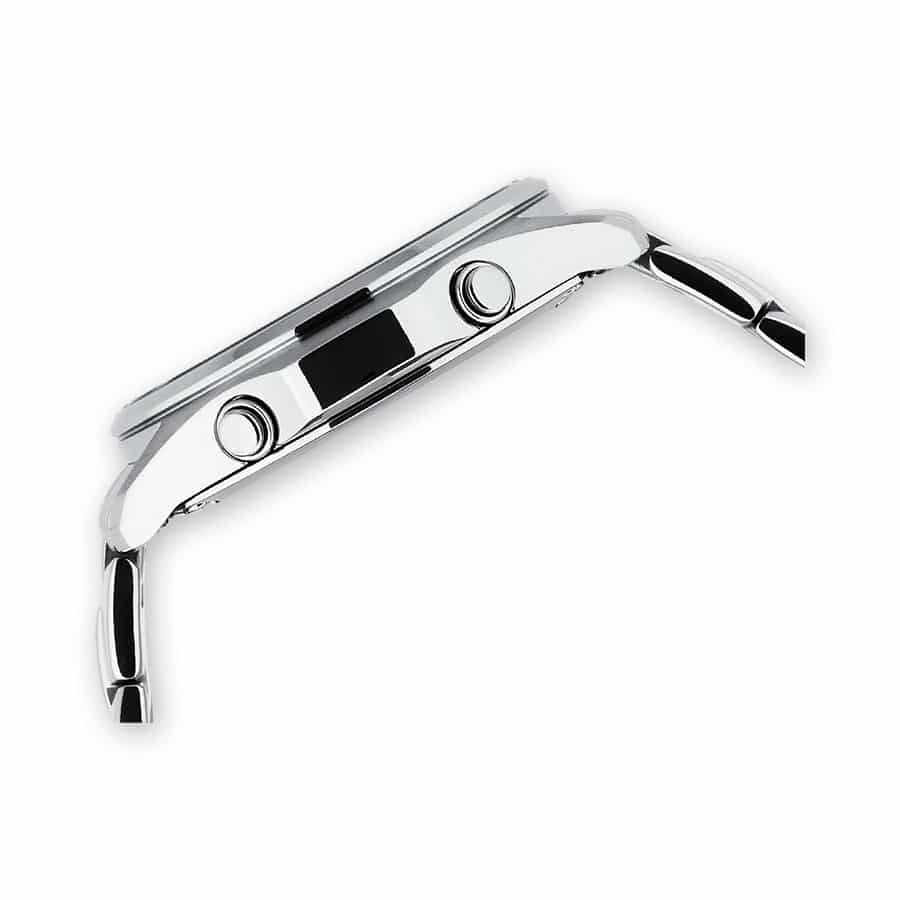 Questo modello presenta un doppio quadrante analogico e digitale, la leggibilità di quest’orologio è perfetta, gli indici sono e le lancette inoltre sono trattate con una sostanza luminescente che gli permette di illuminarsi anche al buio.