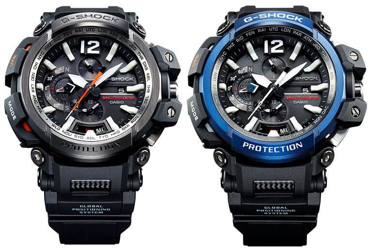 Pur non essendo dei veri e propri strumenti professionali, c’è da sottolineare che fin dall’esordio sono stati concepiti per essere impiegati in avventure estreme, sportive o di tipo militare; alla fine degli anni ‘90 infatti la gamma G-Shock, che era stata lanciata nel 1983 e stava diventando un fenomeno di moda vantando anche numerosi collezionisti, veniva diversificata da Casio tra linee più morbide, con nuovi colori e modelli anche femminili, e altre più professionali, con rudi dispositivi multifunzione. Nasceva così la Master of G che oggi ricopre un posto di rilievo nel catalogo della Casa giapponese grazie alle serie Gravitymaster, dedicata all’aviazione, Mudmaster, alle attività di terra, e Gulfmaster, alla nautica; per ognuna, abbiamo scelto un modello paradigmatico la cui voluminosa cassa nera in resina sintetica, impermeabile fino a 20 atmosfere, è messa al riparo da colpi e vibrazioni grazie a una solida costruzione antiurto.