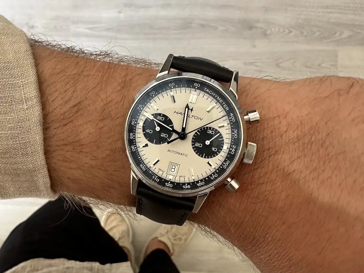 Il suo distintivo quadrante Panda non è solo un richiamo visivo, ma anche un esempio di maestria orologiera, rendendo l’orologio una scelta ideale per l’uso quotidiano tra i collezionisti (ed io lo indosso almeno una volta alla settimana). Con una cassa in acciaio inossidabile di 40 mm di diametro, l’orologio racchiude il calibro Hamilton H-31. Questo movimento cronografico, che trae origine dall’affermato ETA 7753, vanta una riserva di carica di 60 ore e opera ad una frequenza di 28.800 alternanze orarie, garantendo precisione e affidabilità. Il design, chiaramente ispirato alle estetiche vintage, eleva l’Hamilton Intra-Matic a nuove vette nel panorama dei cronografi automatici. I sottoregistri neri, proporzionati e armonicamente distribuiti, non ostacolano la lettura del quadrante, e la tonalità leggermente avorio del quadrante ne esalta la presenza. Immaginate di avere questo pezzo d’arte avvolto attorno al vostro polso – una visione che sicuramente molti desiderano rendere realtà. Consiglio in alternativa, sopratutto per gli appassionati, la versione Intra-Matic H Mechanical, con movimento meccanico a carica manuale (qui per leggere la recensione completa).