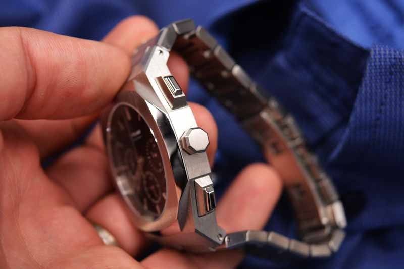 Sul lato destro della cassa abbiamo 3 pulsanti, sui quali sono posizionati i due tasti di attivazione e arresto del cronografo e la corona di forma esagonale di tipo a scatto.