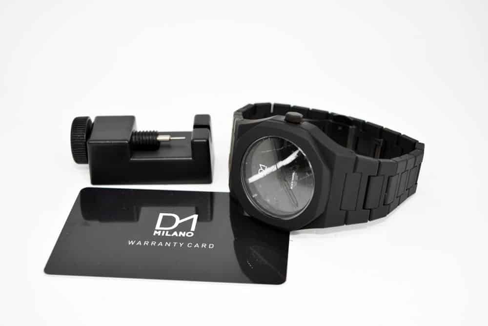 La scatola in cui viene custodito il modello è molto bella, elegante e alla moda; al suo interno troviamo una card della D1 Milano (che rappresenta la garanzia dell’orologio), il libretto delle istruzioni e un dispositivo che permette la regolazione della lunghezza del cinturino dell’orologio (cosa che personalmente trovo utilissima).