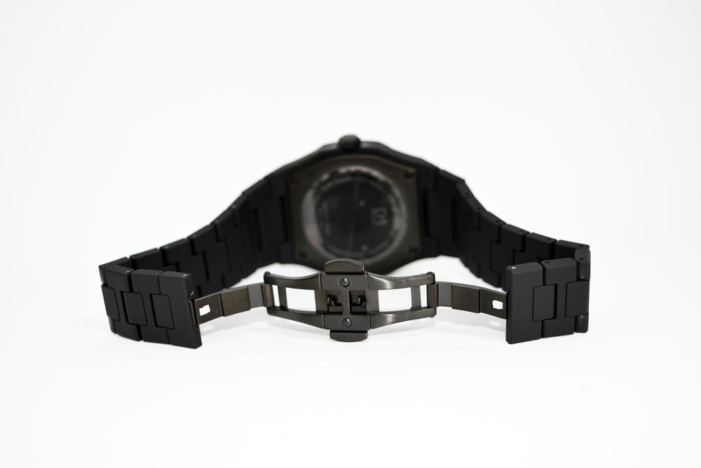 Gli indici sono realizzati in metallo e hanno un taglio diamante laser blu opaco, mentre il fondello in acciaio inossidabile è chiuso con 4 viti di sicurezza.