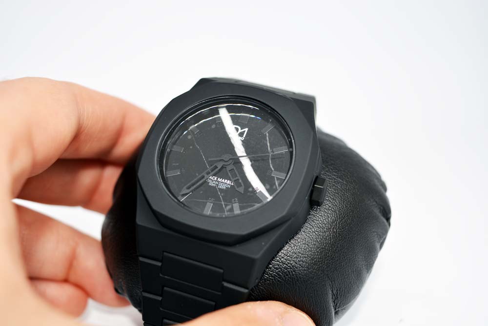Il vetro di tipo minerale protegge il quadrante in marmo naturale italiano, che è una delle caratteristiche principali e tipiche dell’orologio (da cui prende ispirazione anche il nome della linea); il colore di base è il nero puro e all’interno si possono apprezzare delle bellissime venature bianche. L’utilizzo del marmo naturale permette ad ogni modello di essere diverso dagli altri, in quanto le venature del marmo non sono mai tutte uguali.