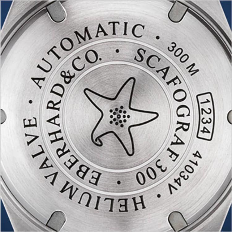 Il fondello è in acciaio, proprio come la cassa da 43 mm, è avvitato alla carrure. Soluzione che contribuisce al raggiungimento delle 30 atmosfere di impermeabilità dello Scafograf 300 Edizione «MCMLIX». È poi personalizzato con l’incisione di una stella marina.