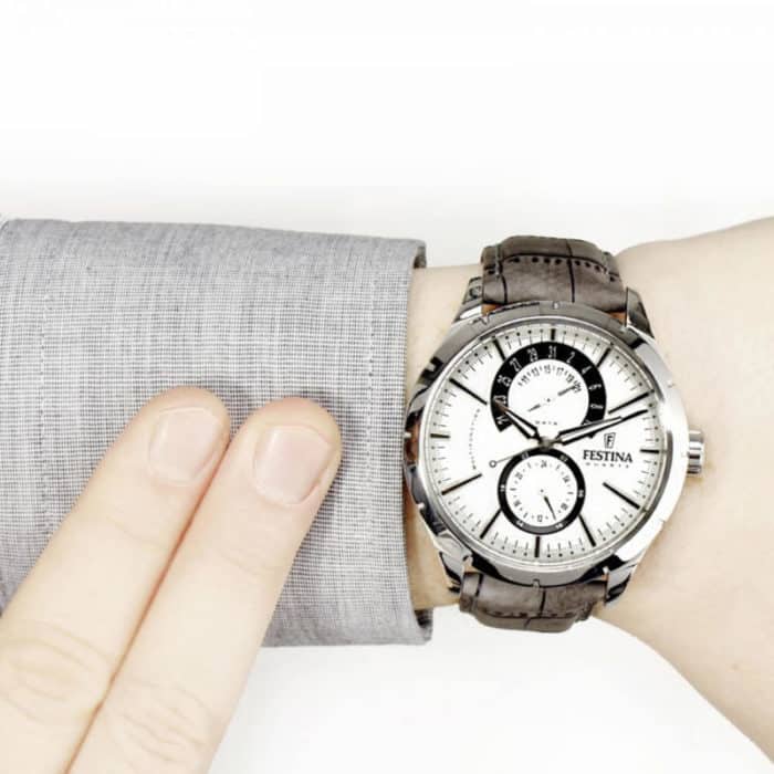 Il Festina F16573/2 è molto simile al modello precedente, sempre con cassa da 45 mm in acciaio ma all’interno del quadrante bianco i colori delle 2 lunette è nero ed il cinturino è di pelle di vitello di colore marrone. Prezzo di listino è 99,00 euro. Su Amazon è possibile risparmiare oltre 20,00 euro. CLICCATE QUI PER SCOPRIRE LE OFFERTE.