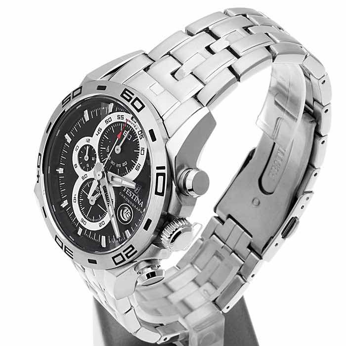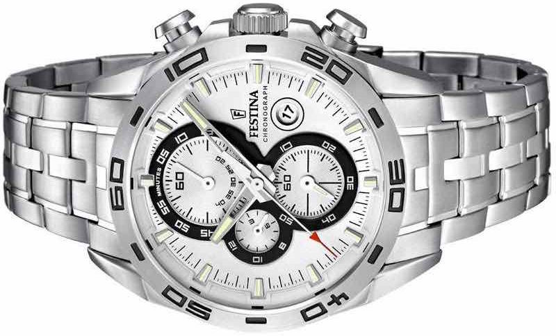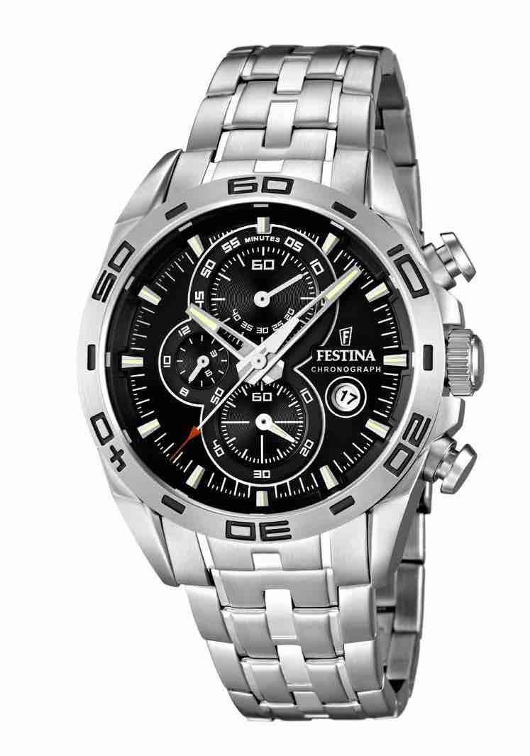 Il Festina f16654/3 è un modello da uomo, anche questo come gli altri ha un aspetto sportivo anche se con un tocco di raffinatezza offerto dall’azienda. L’orologio è completamente in acciaio inox, la cassa misura 45mm, quindi come gli altri è ben visibile, l’orologio possiede un cronografo. Il quadrante è di colore nero, quindi in questo modello troviamo le funzioni del cronografo sul quadrante in bianco.