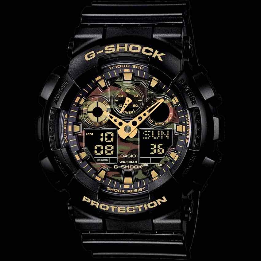 Modello in resina nera, con la doppia funzione digitale e analogica. Gli indici, le lancette e i dettagli del modello sono in oro. Molto interessante il quadrante in stile mimetico, ideale per chi ama gli orologi militari.