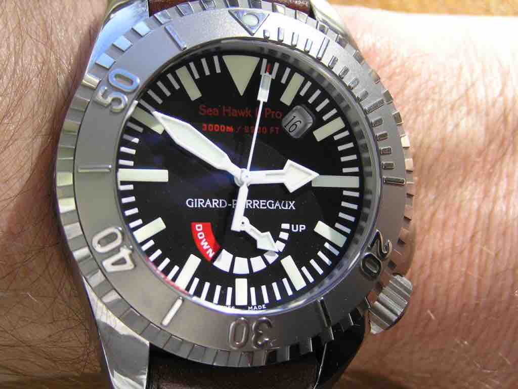 Il Girard Perregoux Sea Hawk è un orologio più sportivo, ha una cassa in titanio color argento, il quadrante è di colore nero con indici presentati con numeri arabi bianchi che fanno di contrasto allo sfondo nero del quadrante. Il modello è impermeabile fino a 300 mt. Il cinturino è in gomma colore nero. Il prezzo del Girrard Perregoux Sea Hawk è di 3495,00 euro.