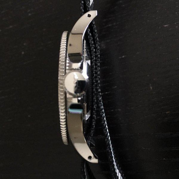 Il quadrante è completato da un vetro in zaffiro elegante e resistente. Le lancette ‘Mercedes-Benz‘ riprese direttamente da Rolex sono molto visibili grazie al buon contrasto di colore con il quadrante sottostante, anche i caratteri sono facilmente leggibili grazie all’utilizzo del classico font Glycine semi-serif.