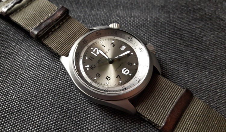 Il Khaki Aviation Pilot Pioneer Auto Ref. H76455933 presenta cassa in acciaio, quadrante nere e cinturino in tessuto di tipo Nato. Prezzo di listino: 925 euro.