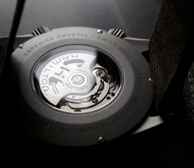 Il fondello, a vista sul movimento H-10, riporta la referenza e altre informazioni di base sull’orologio. Per poter osservare il movimento, bisogna però sfilare il cinturino NATO, che normalmente copre la finestra sul calibro.