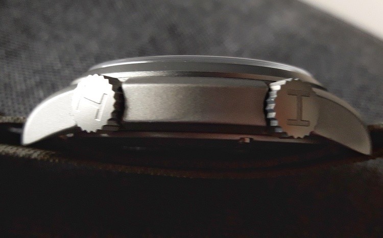 Dicevamo delle corone: entrambe riportano la H di Hamilton a rilievo, azionano la ghiera bidirezionale interna (quella ad ore 2), e consentono la regolazione dell’ora (quella ad ore 4). Nonostante la buona resistenza all’acqua di 100 metri, in questa referenza si dovrà fare a meno delle corone a vite. Segnalo comunque che non ho rilevato alcuna possibilità di spostamento fortuito della ghiera interna, dato che la cassa protegge correttamente la corona anche da attivazioni indesiderate.