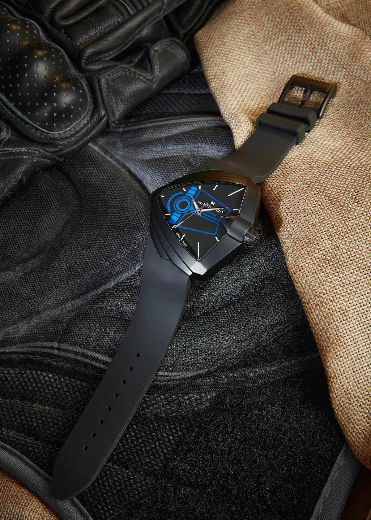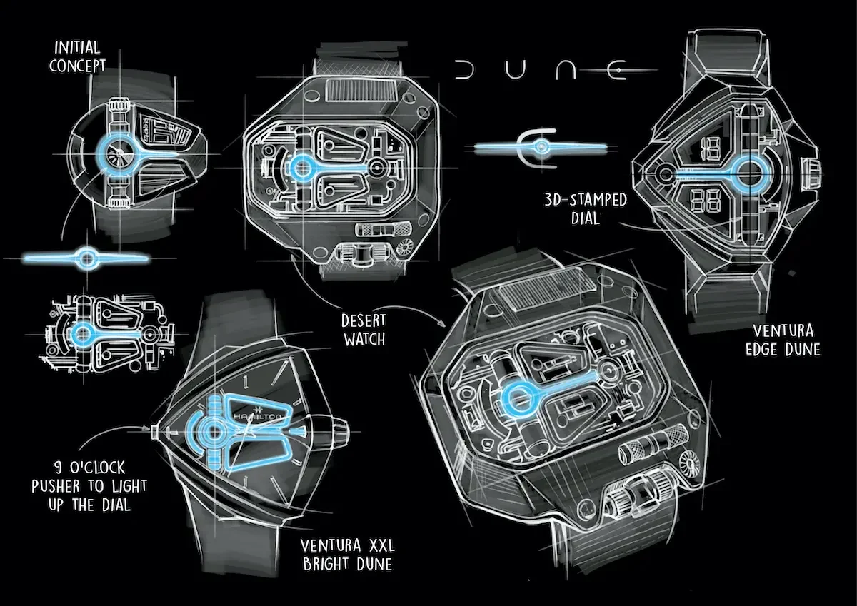 Il primo modello della serie, il Ventura XXL Bright Dune in edizione limitata, unisce la visualizzazione analogica del tempo con tre lancette classiche a un elemento distintivo nascosto al di sotto. Il suo quadrante evoca gli iconici occhi blu dei Fremen, con linee blu luminose che richiamano il design del quadrante del “Desert Watch”, attivabili tramite un pulsante integrato nella corona. Questo modello di dimensioni generose (52 mm x 46,6 mm) è fabbricato in acciaio con finitura in PVD nero opaco e si abbina a un cinturino in caucciù nero.