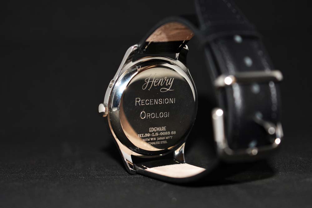 La lente bombata in vetro di Hesalite conferisce all’orologio quello stile retrò, tanto ricercato dalla casa madre; il fondello a pressione, invece, presenta in alto il logo Henry London e in basso le caratteristiche tecniche dell’orologio e il suo codice identificativo. Punto decisamente di forza del brand è la possibilità di personalizzare il fondello di tutti gli orologi: noi abbiamo scelto di incidere il nome del nostro blog, “Recensioni Orologi“.