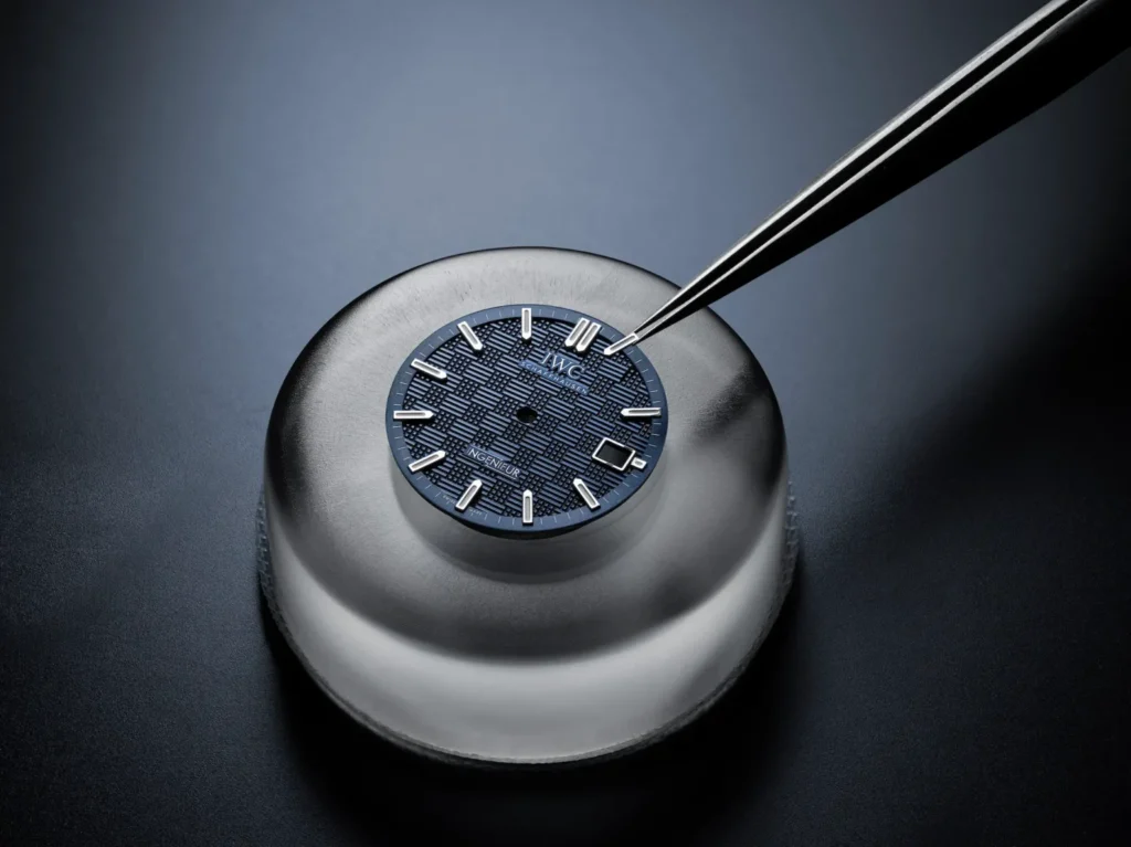 Il quadrante nasce da un grezzo in ferro dolce stampato, successivamente trattato con un rivestimento PVD per ottenere questa nuova e affascinante tonalità di blu, una scelta classica che si integra perfettamente con l’identità dell’Ingenieur. Completano il design indici applicati e lancette luminose, oltre a una finestra per la data incorniciata da un disco a due cifre, che aggiunge un tocco di equilibrio e funzionalità al tutto.