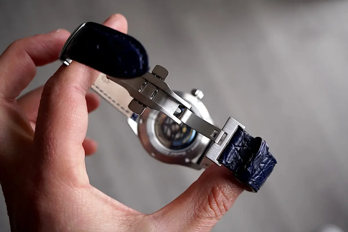 Il bracciale in pelle di alligatore, realizzato con maestria artigianale, è accuratamente cucito a mano e si conclude con una fibbia deployante a doppio pulsante, elegantemente personalizzata con il logo del marchio.