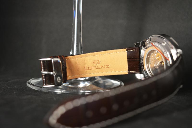 Ad ore 3 una piccola finestra mostra il datario con numeri neri applicati su una superficie argentata, mentre ad ore 12 troviamo il logo Lorenz con la scritta Automatic e, infine, a ore 6 il nome del modello. A proteggere il tutto ovviamente troviamo il vetro zaffiro, quasi perfettamente perpendicolare all’estremità più alta della cassa.