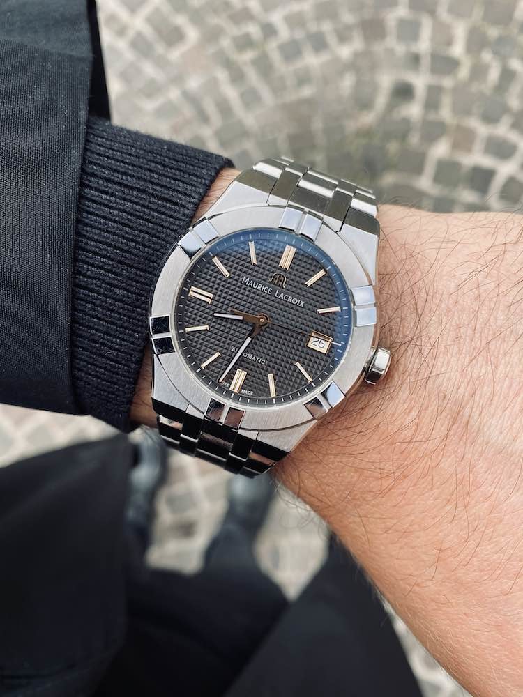 Nell’immagine in alto potete vedere il Maurice Lacroix Aikon 39mm indossato sul mio polso che misura di 17,5 cm, in modo da farvi un’idea di com’è indossato.