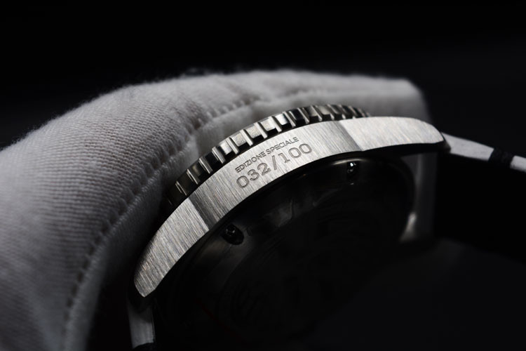 Sulla parte sinistra della cassa troviamo l’incisione dell’edizione limitata dell’orologio, 32/100.