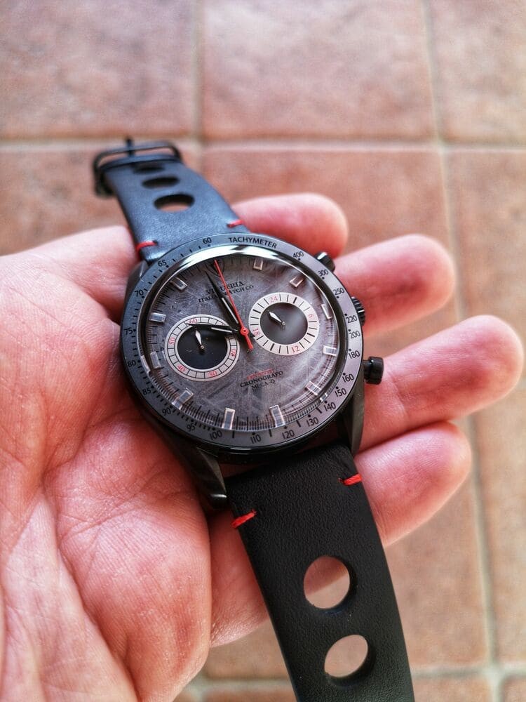 La versione Meteorite, a mio modo di vedere è davvero affascinante, con la ghiera grigia trattata anch’essa in DLC come la cassa ed un bellissimo quadrante realizzato lavorando un vero meteorite piovuto anni fa in terra svedese. Al polso, l’orologio è davvero cattivo.