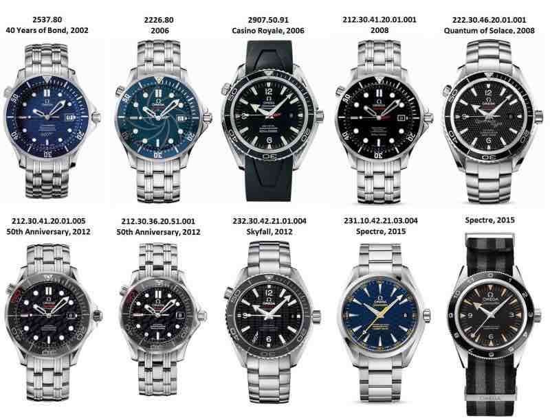 Omega propone e proponeva diversi modelli nel suo catalogo dedicati all’agente James Bond questi sono il Seamaster 300 mt Co-Axial 41 mm, il Planet Ocean Big Size, il Seamaster Planet Ocean Co-Axial, il Seamaster Planet Ocean 42 mm Co Axial, il Seamaster Aqua Terra 38,5 mm. E l’omega Seamaster Aqua Terra James Bond limited Edition.