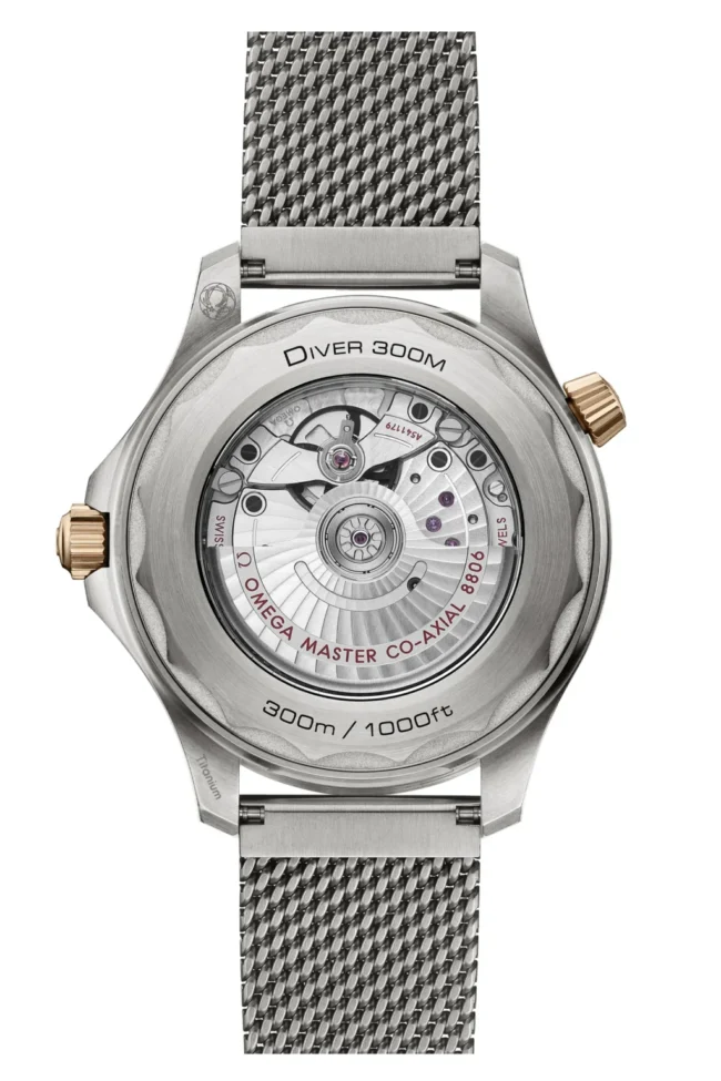 Ci troviamo di fronte a un’ulteriore evoluzione del Seamaster Diver 300M, un modello che si distingue per il suo carattere unico e per dettagli dal fascino vintage. Seguendo le recenti edizioni in acciaio introdotte da Omega, questa nuova variante arricchisce la collezione no-date con uno stile retrò e una scelta di materiali davvero particolare. La cassa combina titanio grado 2 e oro di bronzo, mentre la lunetta e il quadrante sono realizzati in alluminio. Omega, come da tradizione, dimostra una certa audacia nel giocare con materiali non convenzionali, e qui il protagonista è il loro innovativo bronzo-oro: una lega composta per il 50% da rame, il 37,5% da oro e una selezione di altri elementi. Questo materiale, certificato come oro 9 carati, aggiunge un tocco esclusivo e raffinato.