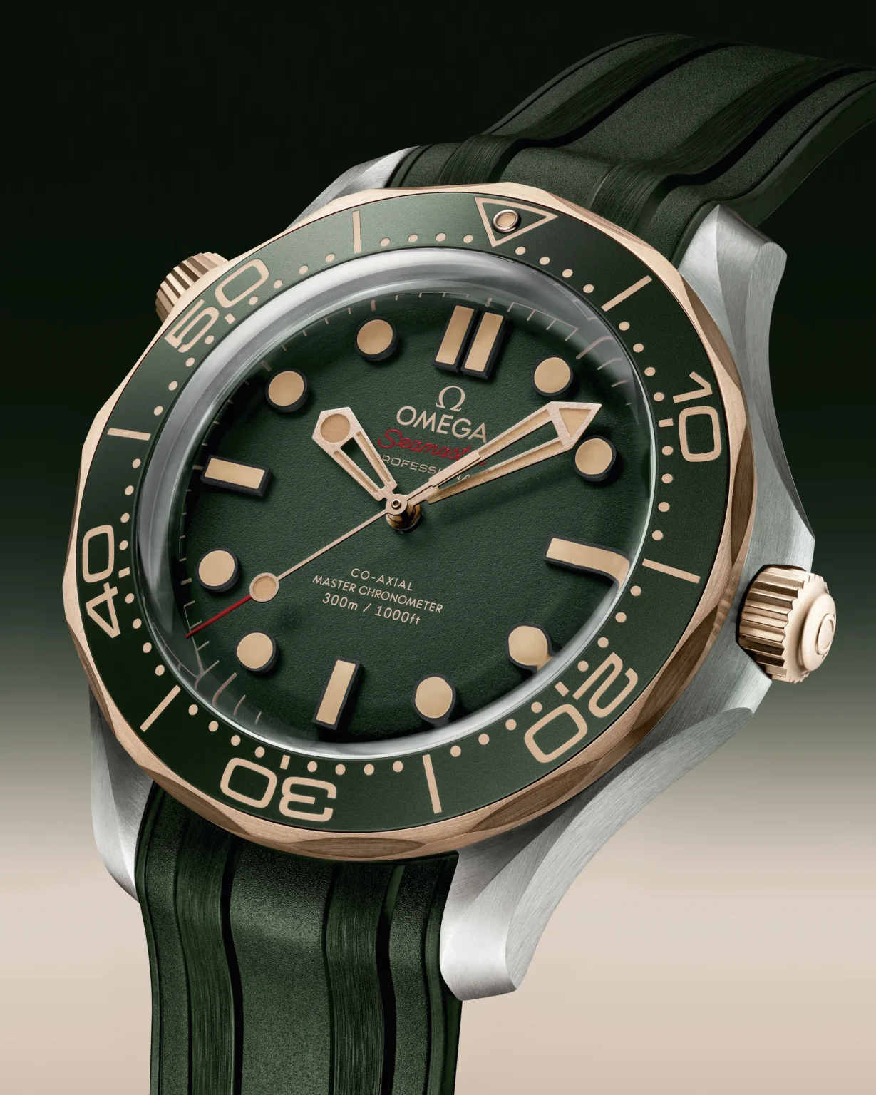 Il Seamaster Diver 300M No-Date Titanium & Bronze Gold è presente in collezione in due opzioni: un cinturino in caucciù verde con chiusura a deployante o il raffinato bracciale in titanio grado 2, caratterizzato dalle iconiche maglie già viste nella versione 007 Edition.