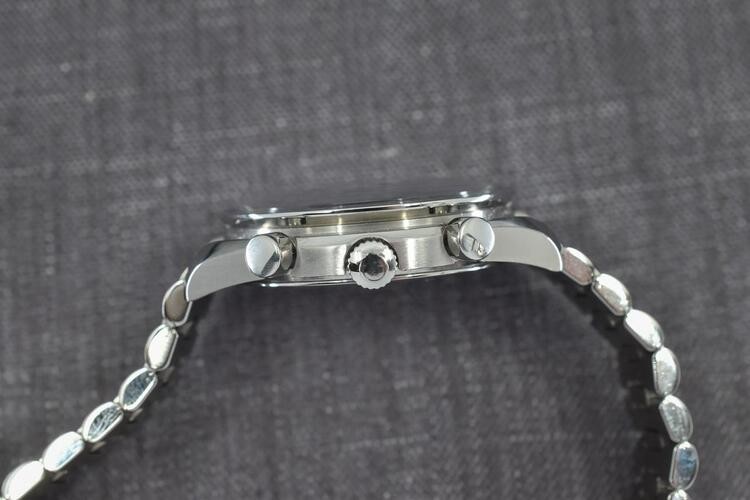 Dal lato della corona, noterete che i pulsanti del cronografo si trovano leggermente più in alto della corona con logo in rilievo.