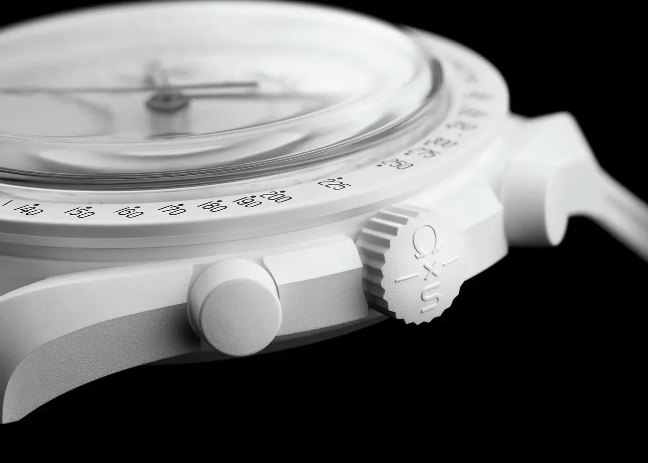 Perfettamente in linea con la sua estetica monocromatica, il nuovo Omega X Swatch MoonSwatch Mission to the Moonphase si presenta con un quadrante di immacolato bianco, rifacendosi all’Omega Speedmaster Moonwatch di recente introduzione, anch’esso caratterizzato da un quadrante bianco laccato. Al pari del prestigioso Speedmaster di Omega con quadrante bianco, questo nuovo Mission to the Moonphase Moonwatch sfoggia lancette e dettagli sul quadrante in netto contrasto nero.
