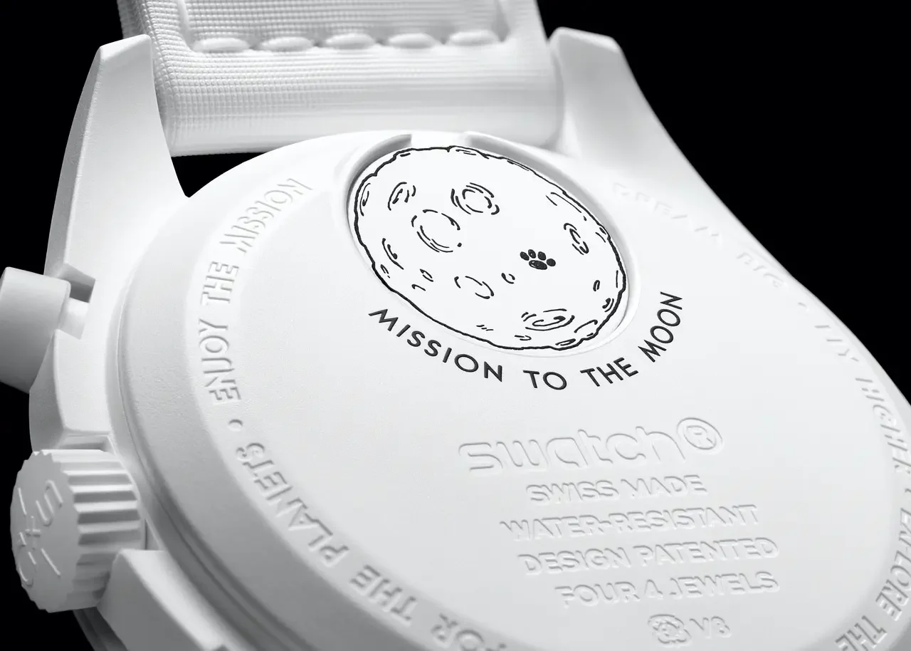 A differenza del modello standard di ETA, che include opzioni aggiuntive come un calendario e un piccolo contatore delle ore posizionato sul quadrante cronografico alle 10, questa nuova interpretazione del MoonSwatch Mission to the Moonphase sembra omettere tali funzionalità. Nonostante ciò, conserva la caratteristica funzione cronografica a 60 minuti presente nei MoonSwatch classici, arricchita dalla peculiare indicazione delle fasi lunari alla maniera di Snoopy.