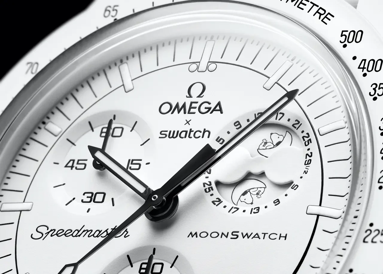 A due anni di distanza dal debutto del primo MoonSwatch, la collezione, che ha riscosso un enorme successo, si arricchisce ora di una nuova colorazione. Questa nuova edizione, denominata Omega X Swatch MoonSwatch Mission to the Moonphase in Bioceramica bianca, introduce al posto del contatore dei 1/10 di secondo tipico della serie originale, una complicazione dedicata alle fasi lunari, decorata con il tema di Snoopy.