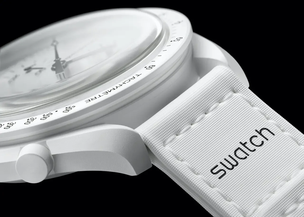Per armonizzare il tutto con il tema bianco dominante, l’orologio è dotato di un cinturino in velcro bianco con dettagli in bioceramica bianca, in linea con gli altri modelli della collezione MoonSwatch che presentano lo stesso tipo di cinturino.
