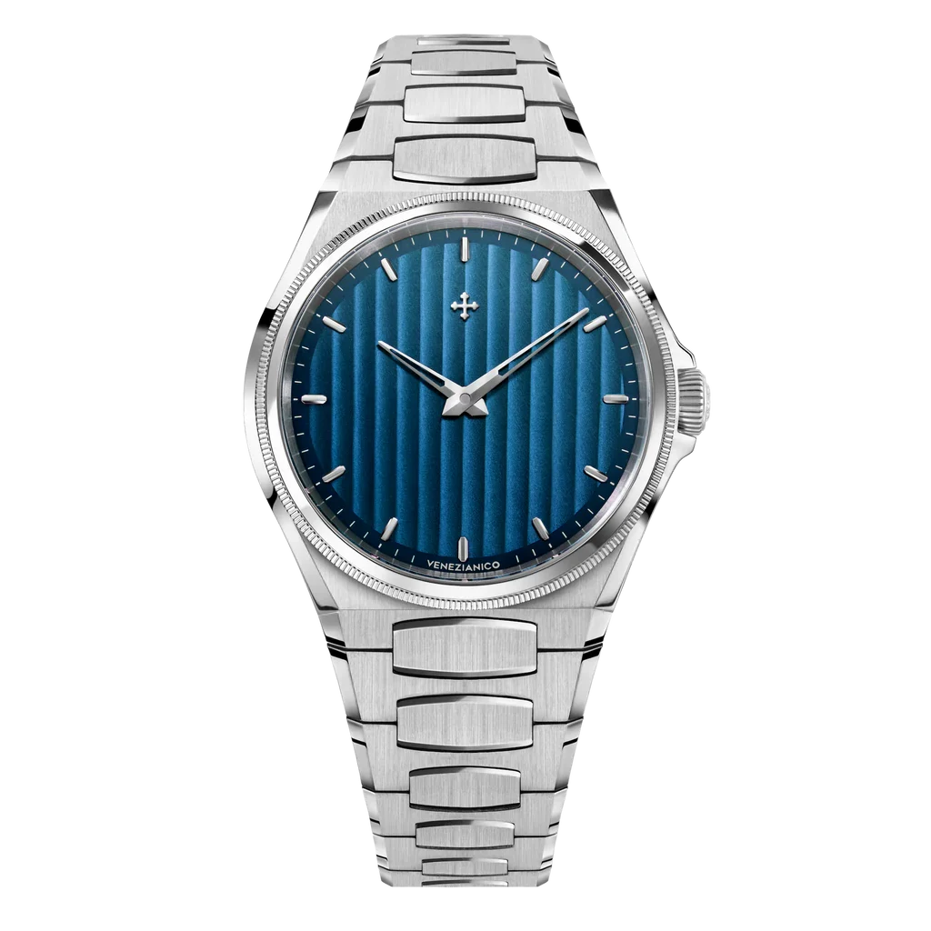 Ispirato all’iconico edificio veneziano dell’Arsenale, innovativa struttura industriale edificata nel 1104, l’orologio Arsenale di Venezianico unisce un design contemporaneo a uno stile essenziale, con omaggi all’orologeria classica. Tra i dettagli spiccano la finitura a “côtes de Genève” sul quadrante — disponibile nelle tonalità blu, antracite e viola — e le lancette scheletrate in stile Dauphine. Questo segnatempo si distingue per la cassa in acciaio da 40 mm, che combina superfici lucide e satinate, e per il bracciale Canova Concept integrato, con maglie piatte e moderne, valorizzate da due bisellature lucide che risaltano sulle superfici satinate per un effetto sofisticato. Sul fondello inciso con le torri dell’Arsenale si trova un movimento automatico meccanico, il calibro Miyota 9029, che completa la cura dei dettagli di questo modello.