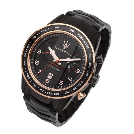 Questo modello, è tra gli orologi Maserati, con la cassa più grande ed evidente. Infatti l’orologio Corsa oro/nero, con referenza 920005485, si presenta con una cassa in acciaio da 46 mm. La cassa presenta poi un quadrante lavorato su due livelli differenti. Nella zona centrale il motivo del quadrante si ispira alla trama della fibra in carbonio, richiamando così alcune delle caratteristiche del mondo sportivo automobilistico. Sulla lunetta cronografica dell’orologio troviamo anche la scala tachimetrica, curata in ogni minimo particolare.