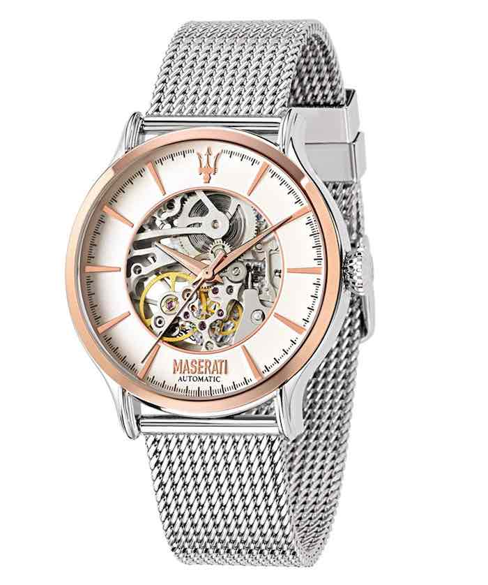 La caratteristica di questo orologio Maserati automatico è data anche dall’abbinamento tra la cassa in acciaio da 42 mm, con i dettagli in oro roso placcato. Questa classica viene abbinata anche un bracciale in maglia Milanese, realizzato in acciaio. Il quadrante è molto particolare con un’ampia finestra centrale che mostra il movimento automatico dell’orologio Skeleton (SEAGULL TY2809). Anche il fondello è a vista con corona a vite, infine, l’orologio è impermeabile fino a 100 mt.