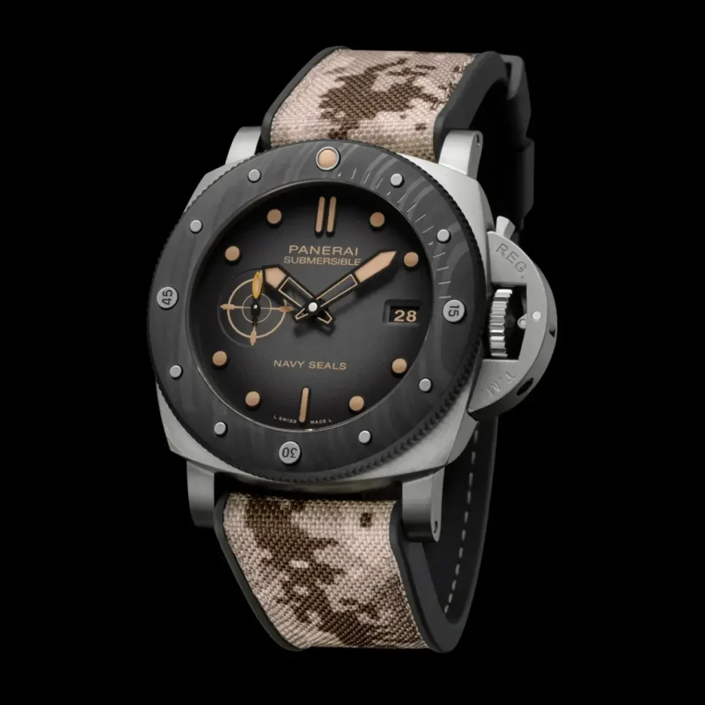 Il logo “Navy SEALs” è visibile sotto le lancette centrali di ore e minuti, mentre i piccoli secondi trovano posto nel quadrante secondario a ore 9. Ulteriori riferimenti all’unità militare includono il logo inciso sul fondello e il cinturino ibrido in tessuto e caucciù, con un motivo mimetico. Al cuore di questo segnatempo si trova il calibro P.900, che offre una riserva di carica di 72 ore, un movimento consolidato per Panerai e spesso recensito sul blog. Questo modello incarna l’essenza dell’orologio da immersione e, con un prezzo di 10.400 €, ne riflette il valore.