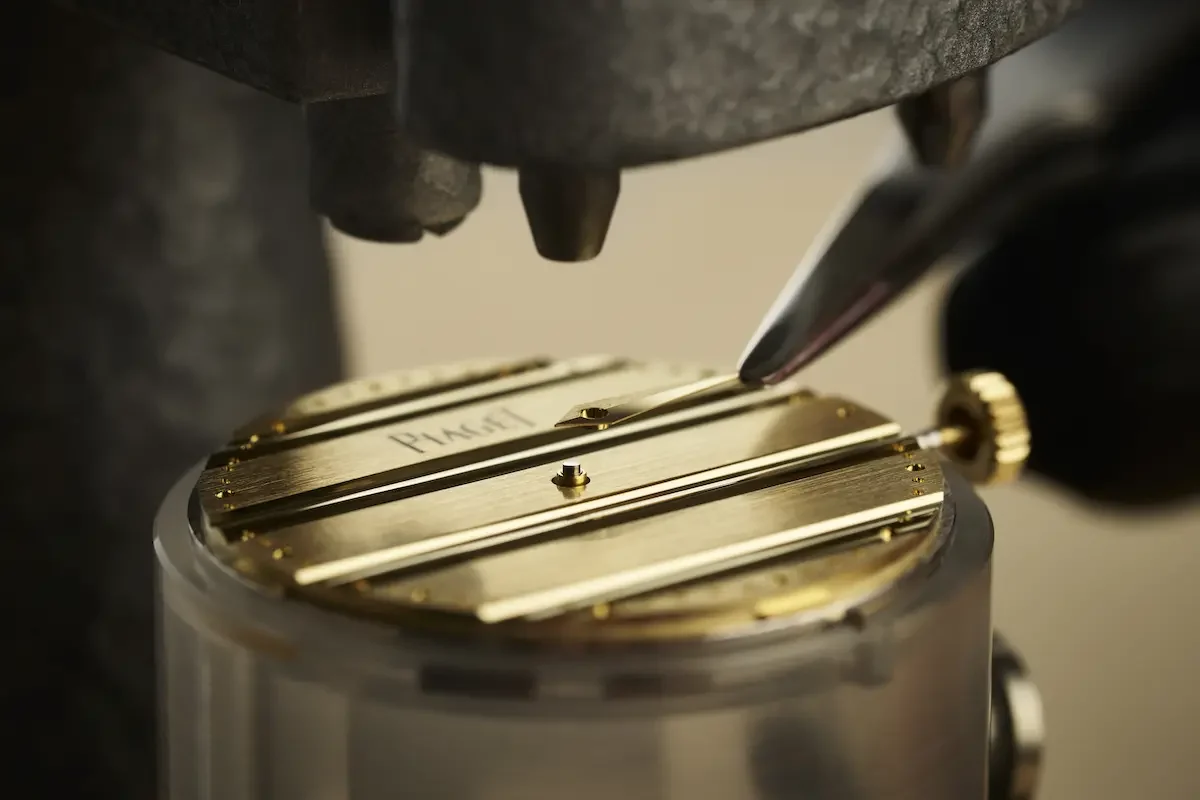 Il fondello trasparente del Piaget Polo 79 svela il raffinatissimo movimento automatico Piaget 1200P1, diretto discendente dell’illustre calibro 12P. Questo meccanismo, con un diametro di 29,9 mm e uno spessore minimo di 2,35 mm, si avvale di un micro-rotore decentrato per il suo carica automatica. Funzionando a una frequenza di 3 Hz, offre fino a 44 ore di autonomia quando completamente carico. La sua eccellenza artigianale si manifesta nelle finiture di alto livello: una platina decorata con finitura circolare, ponti elegantemente smussati adornati da Côtes de Genève circolari, ingranaggi finemente decorati con motivo soleil e viti temprate in blu.
