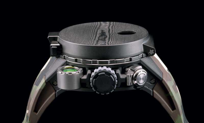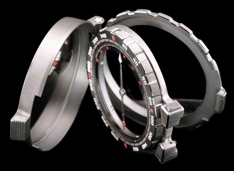 BUSSOLA. La bussola è composta da due lunette, una fissa e una girevole, entrambe in titanio grado 5 con rivestimento superficiale DLC e di vetri in zaffiro. Viene fissata alla cassa con un sistema a baionetta. Anche il suo coperchio è realizzato in Carbon TPT® e incorpora uno specchio con una apertura a ore 12 che permette un allineamento preciso con la lancetta della bussola. Una livella a bolla, contenuta in una capsula in titanio, consente di mettere in piano l’orologio per una maggior accuratezza di puntamento. Una volta smontata, la bussola può essere riposta su una placchetta in Carbon TPT®. Ideale per l’orientamento, questo sistema fornisce un certo numero di elementi, tra cui delle linee incise che indicano la direzione da prendere quando si segue un percorso o una mappa.