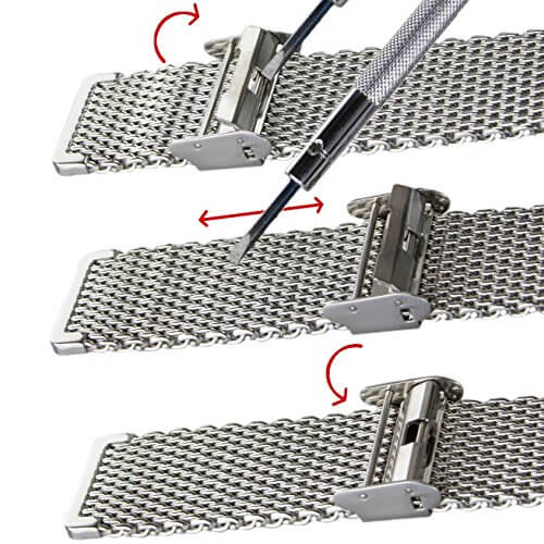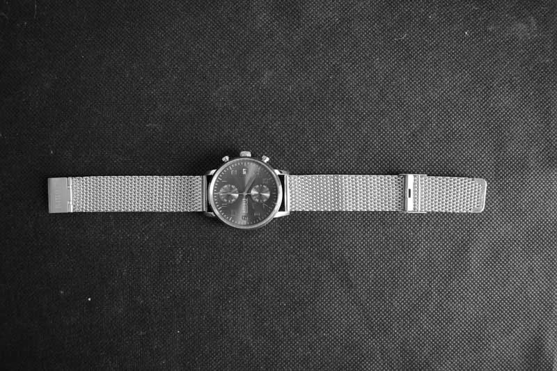 La maglia milanese è davvero bella ed elegante, di ottima fattura, con uno spessore di 20 mm e una lunghezza del cinturino di 20 cm. Quest’ultima è regolabile grazie alla chiusura realizzata con una fibbia di tipo deployante in acciaio inox e finitura satinata riportante l’ incisione del marchio. Anche se l’orologio è interamente in acciaio, il suo peso è molto ridotto, ossia di circa 108 gr. non recando alcun fastidio al polso.