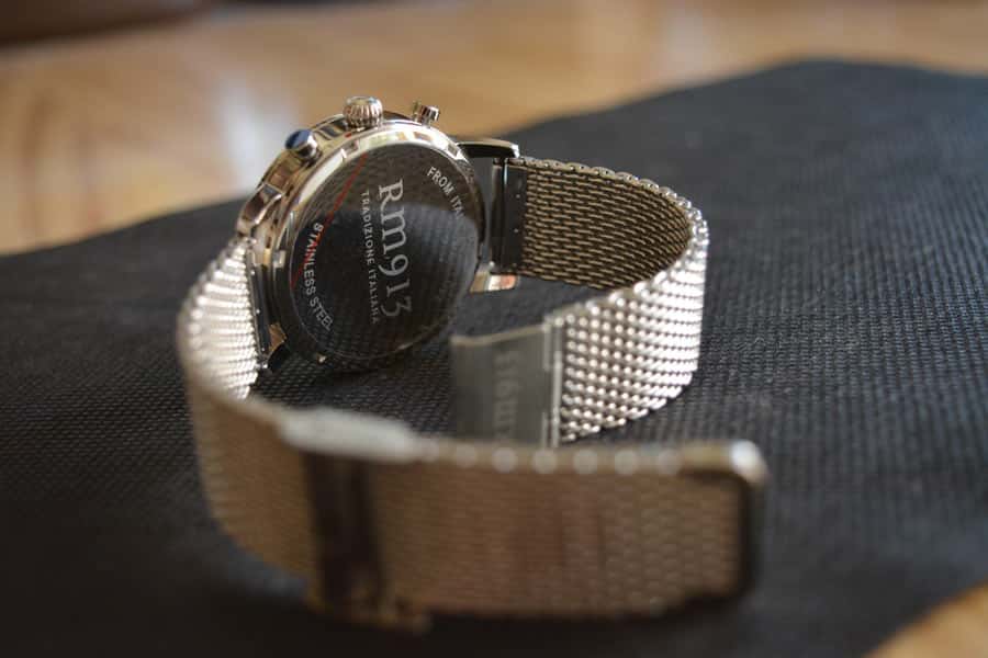 Il modello RM913 Milanese Chrono Grey è un cronografo davvero molto elegante che ha ben impressionato le persone che lo hanno visto indossato sul mio polso. L’orologio ha una cassa in acciaio inox con una dimensione di 40 mm di diametro e 11 mm di spessore; la cassa infatti con il suo spessore permette all’orologio di non passare inosservato e di avere un aspetto “pronunciato” che gli permette di essere facilmente visto sul polso.