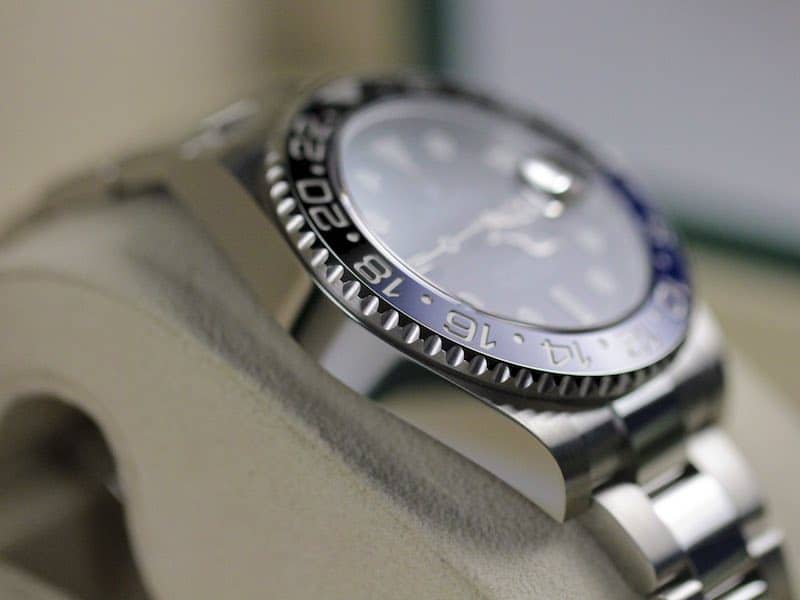 E bene, il nome è dovuto proprio alla lunetta e alla sua doppia colorazione nero e blu. La lunetta di questo modello è forse uno dei dettagli più importanti. Questa infatti è la prima lunetta realizzata completamente in ceramica bicolore e ad essere applicata su un modello Rolex. In molti, direte che non è vero perché anche la lunetta Pepsi presenta la doppia colorazione rosso/blu. Eh, bene, in realtà la lunetta Pepsi non è la prima lunetta bicolore in ceramica, in quanto tutti i modelli antecedenti al GTM Batman Rolex, in realtà, avevano la lunetta con inserti in alluminio, quindi questa non era totalmente in ceramica.
