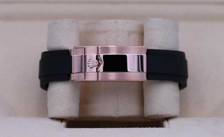 Abbinato per colore e materiale alla cassa in oro 18K, il cinturino nero è dotato di una chiusura di sicurezza Oysterlock anch’essa in lega Everose 18K che impedisce l’apertura accidentale. Purtroppo questo fermaglio non presenta il collegamento di sistema Easylink che consente a chi lo indossa di estendere l’ultimo link. Tuttavia, micro-regolazioni sono ancora possibili spostando il solido anello attraverso i tre piccoli fori all’interno della chiusura.
