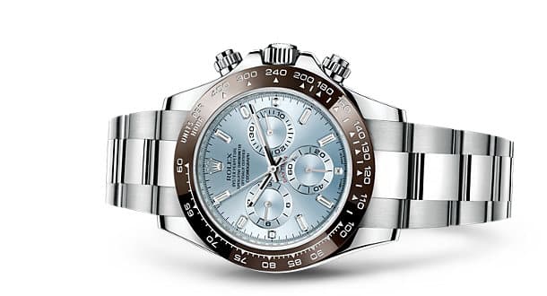 Due dettagli da notare sono il sottile filo metallico che corre lungo l’estremo bordo della lunetta e i contatori più proporzionati con anelli contrastanti. Nella foto è rappresentato il Daytona in platino 950 con quadrante blu ghiaccio, in vendita al prezzo di 70.800 euro. Online le quotazioni sono già raddoppiate rispetto a questo prezzo.