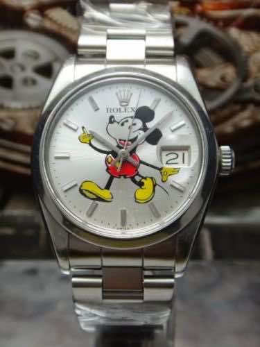 Il Rolex Topolino, creato dall’azienda per Walt Disney e mai messo in commercio è stato realizzato negli anni ’60, Topolino è semplicemente stampato sul quadrante, quindi non sono le sue braccia a segnare ore e minuti come nel modello della Ingersol, ma sono gli indici e le lancette di serie dell’azienda a segnare l’ora sul quadrante.