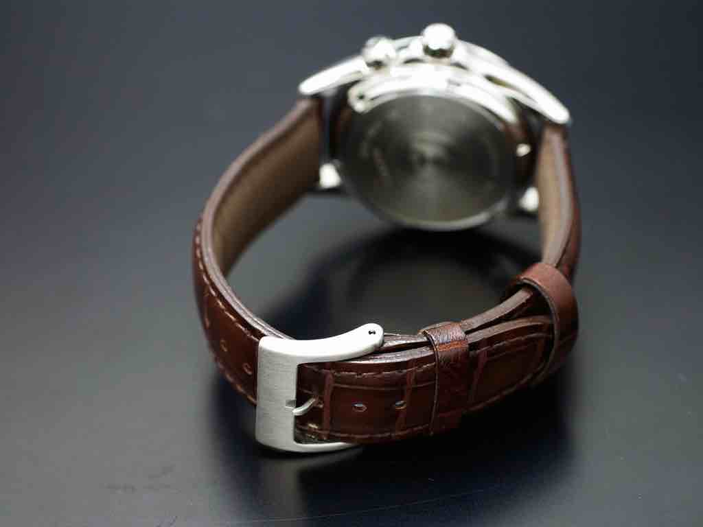 - Cinturino: Pelle marrone con goffratura in alligatore