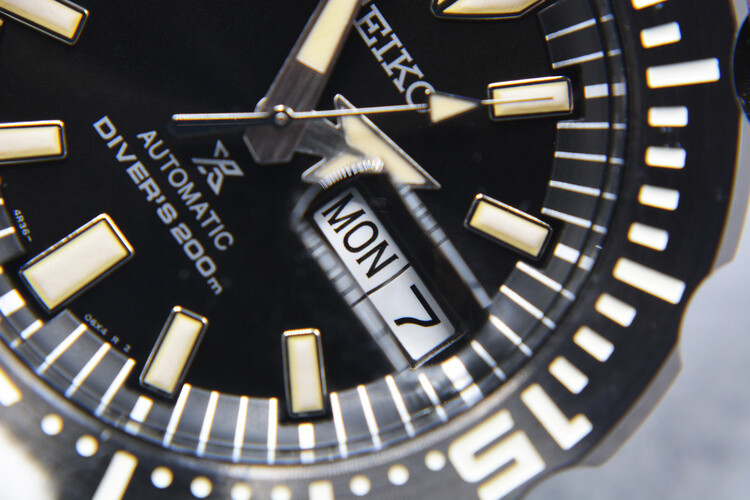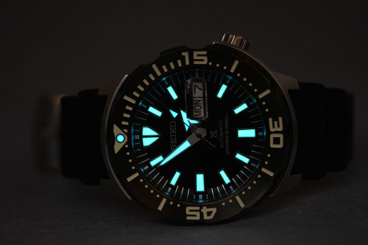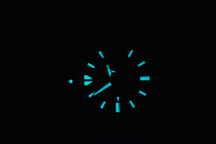 Come ci si aspetterebbe su un orologio subacqueo in generale da un segnatempo a firma Seiko, lancette e indici sono trattati con una generosa quantità di Lumibrite per una migliore visibilità anche sott’acqua, in condizioni di buio o torbido.