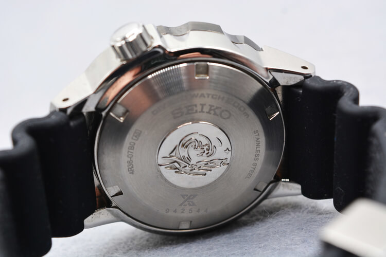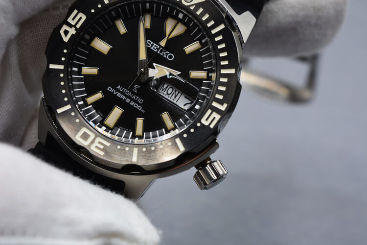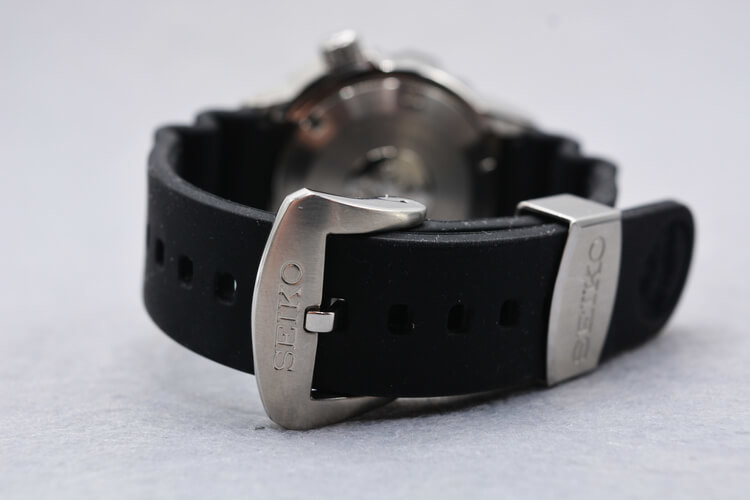 A chiuderne il look, il nostro Prospex Monster è dotato di un cinturino in gomma nera morbida e confortevole, con fibbia di chiusura e fermo in acciaio inossidabile marchiati Seiko, che fa scendere il peso complessivo di questo diver a 117,37 grammi (rispetto ai 186,9 grammi della sua controparte con bracciale in acciaio) ed è abbastanza elastico per poter essere indossato comodamente sopra una muta.