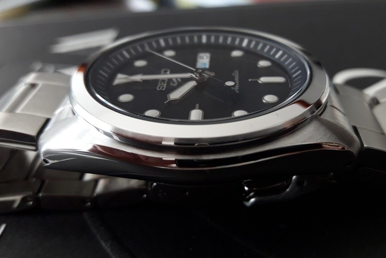Nonostante l’apertura per la data, l’effetto è di generale pulizia: nessuna scritta inutile, con la dicitura “automatic” a ore 6 fa da contrappeso al logo Seiko ad ore 12, mentre un rehaut che riporta i minuti impreziosisce ulteriormente il dial.