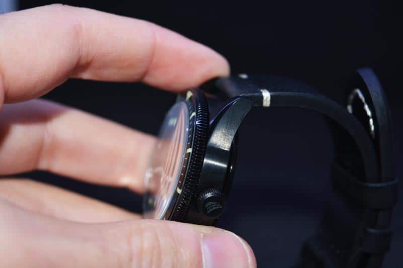 La corona è a vite (non poteva essere altrimenti essendo un modello subacqueo), la trovo molto sicura è facile da ruotare; possiede 3 scatti, al primo abbiamo la carica manuale, al secondo l’impostazione della data e al terzo la regolazione della data (dove avviene il fermo macchina).